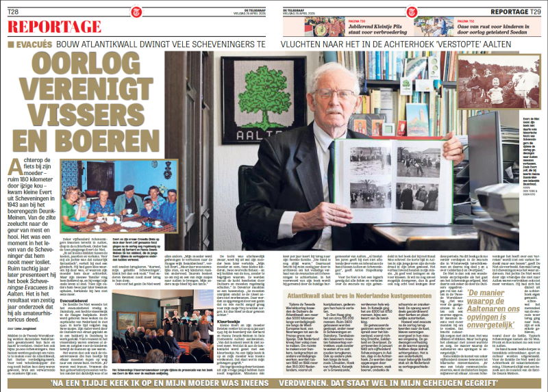 Een jonge Evert de Niet op de boerderij in Aalten. © privéfoto De families moesten hun huizen leeg achterlaten. De inboedels werden op een centrale plaats of in verzegelde kamers opgeslagen. Maar na de bevrijding vonden veel mensen niets meer terug van hun spullen. In de koude winter van ‘42/’43 reden ze in open trams van het vissersdorp naar station Staatsspoor. Met alleen handbagage bij zich. ,,De vrouwen zongen ‘Vaarwel mijn dierbaar Scheveningen’. Veel ouderen keerden niet meer terug.” Kniertje De Niet heeft de afgelopen jaren veel foto’s verzameld over het dagelijks leven in de evacuatieplaatsen. De namen zijn een feest van herkenning voor de zaal. ,,Dit is Kniertje Spaans-den Heijer.” Hij is nauwelijks uitgesproken of er klinkt al: ‘Ik ben de dochter’. Dan een foto van Isaac van der Loo, die een koe melkt. ,,Dat is mijn schoonvader”, zegt iemand. Er volgen bekende families als Dijkhuizen, Bal, Knoester en Roeleveld. Op dat bankje zit schoenma¬ker Jacob Groen, wie kent hem nog? Spreker ,,Op dat bankje zit schoenmaker Jacob Groen, wie kent hem nog?” De spreker heeft zelfs alle namen achterhaald van een groep ouden van dagen, bewoners van het Gereformeerde rusthuis in de Keizerstraat. Ze staan op een foto uit de Lutte bij Oldenzaal. Een verzorgster die nog leeft, kon De Niet verder helpen. Andere afbeeldingen zet hij als zoekplaatje in de Scheveningsche Courant of op Facebook. Ook tragedies uit de jaren in ballingschap stipt hij aan. Johannes van der Zwan werd maar 13 jaar oud, toen hij met een pistool van een Duitser speelde en zichzelf doodschoot. Bij een bombardement door geallieerden in februari 1945 kwamen elf mensen om, onder wie Scheveninger Mink van der Harst. Maar in die hongerwinter waren de evacués wel beter af dan het thuisfront. Hier was volop te eten, terwijl vissersvrouwen in de Haagse regio bij hongertochten hun hoofdijzers en gouden sieraden moesten inruilen voor eten. Nieuw leven Na de bevrijding zijn sommigen ook in de evacuatieplaatsen gebleven: ze trouwden en begonnen een nieuw leven. De Niet vertelt over Aasje de Graaf, die ‘zelfs als vrouw’ de Landbouwschool volgde en trouwde met een Winterswijker. Hijzelf keerde elke schoolvakantie terug naar de boerderij van zijn peutertijd. Evert, zijn gezin en kleinkinderen vertoeven regelmatig in Aalten. Het verhaal gaat dat koningin Wilhelmina na de oorlog een vissersvrouw trof op de boulevard. De vrouw sprak vol warmte over die kleine plaats Aalten, waar boerderijen behalve 500 Scheveningse evacués ook 2500 onderduikers, joden en verzetsmensen herbergden. Hare majesteit was zo onder de indruk van dit verhaal, dat ze aan Aalten haar eerste werkbezoek bracht. Foto’s, documenten en verhalen zijn welkom bij evertdeniet@kpnmail.nl Kerkenrazzia Gevlucht in Scheveningse klederdracht Sommige jongeren uit Scheveningen werden van evacués ook nog onderduikers, toen de Duitsers op jacht gingen naar mensen voor de Arbeitseinsatz. Op 30 januari 1944 was er een razzia op de Westerkerk en de Christelijk Gereformeerde kerk in Aalten. De jongens uit het dorp dachten in een overmoedige bui dat ze wel naar de kerk konden. Maar de Duitsers wachtten hen ‘s zondags op. Mevrouw Visser-Taal hielp Gerrit Hoopman te ontsnappen door hem haar dracht te geven. Verkleed als vissersvrouw wist hij te ontkomen. De Duitsers hadden het niet door, terwijl hij op een mannenfiets reed. Het Nationaal Onderduikmuseum in die plaats liet de historie dit jaar herleven in een drukbezochte tentoonstelling over de kerkenrazzia. Er werden op 30 januari 1944 48 jonge mannen opgepakt. De meesten werden tewerkgesteld, een aantal kwam in concentratiekampen. Vier overleefden de ontberingen niet. In het museum is ook een Scheveningse kamer ingericht.